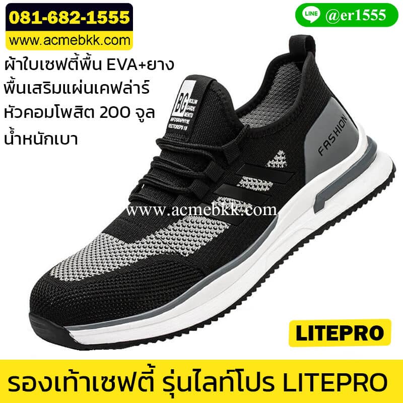 รองเท้าเซฟตี้ เบา รุ่น LITEPRO ผ้าใบเซฟตี้ หัวเหล็กมาตรฐานยุโรป 200 จูล หน้ารองเท้ากว้างใส่สบาย ไม่บีบปลายเท้า พื้นเสริมแผ่นเหล็กกันตะปูได้ ราคาคุ้มค่า คุณภาพเกินราคา สำหรับงานก่อสร้าง, โรงงานอุตสาหกรรม (Factory) เพื่อใช้ป้องกันการบาดเจ็บจากการทำงาน